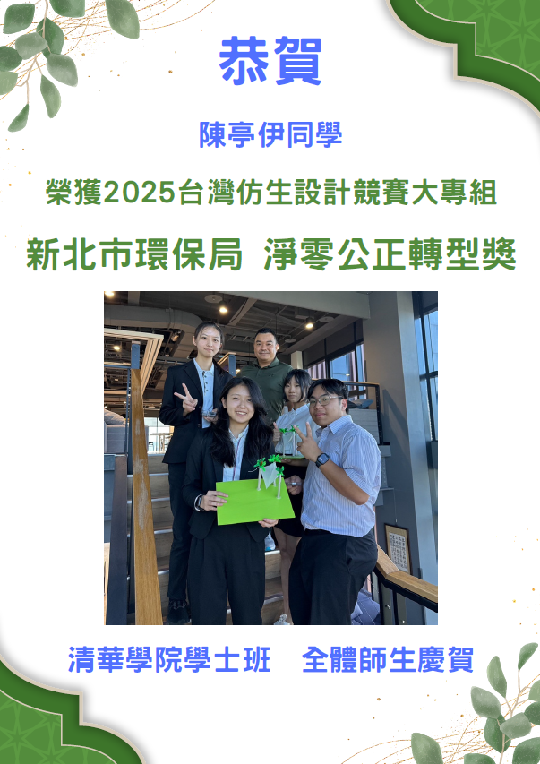 恭賀!陳亭伊同學榮獲2025台灣仿生設計競賽大專組新北市環保局淨零公正轉型獎