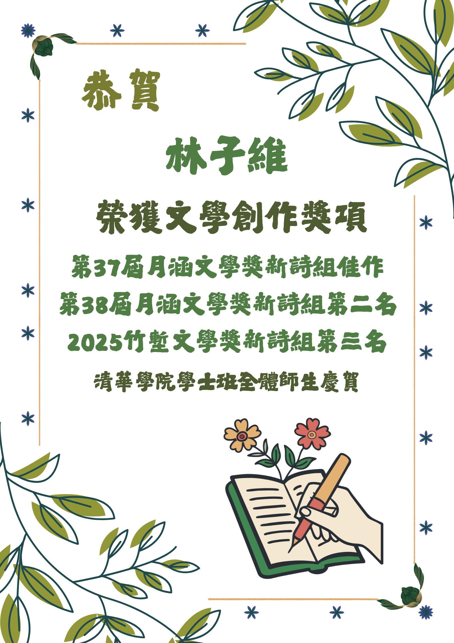 恭賀!林子維同學參加月涵文學獎、竹塹文學獎斬獲佳績