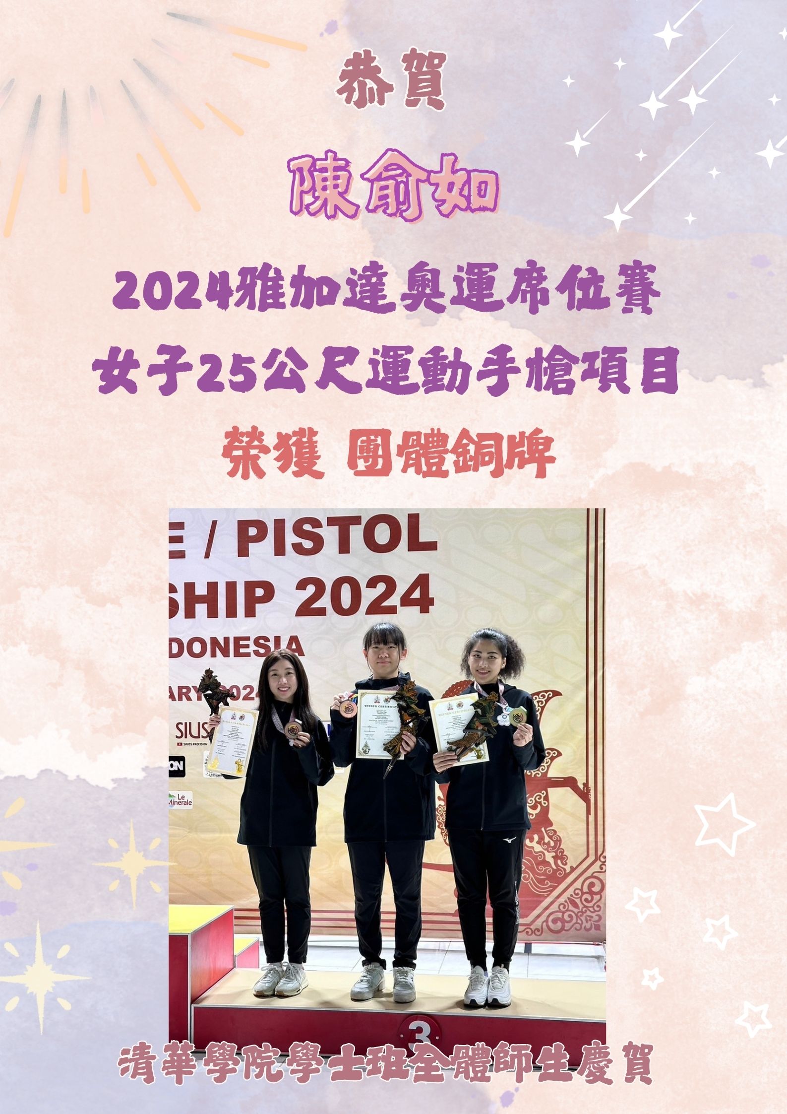 恭賀!陳俞如同學榮獲2024雅加達奧運席位賽女子25公尺運動手槍項目團體銅牌