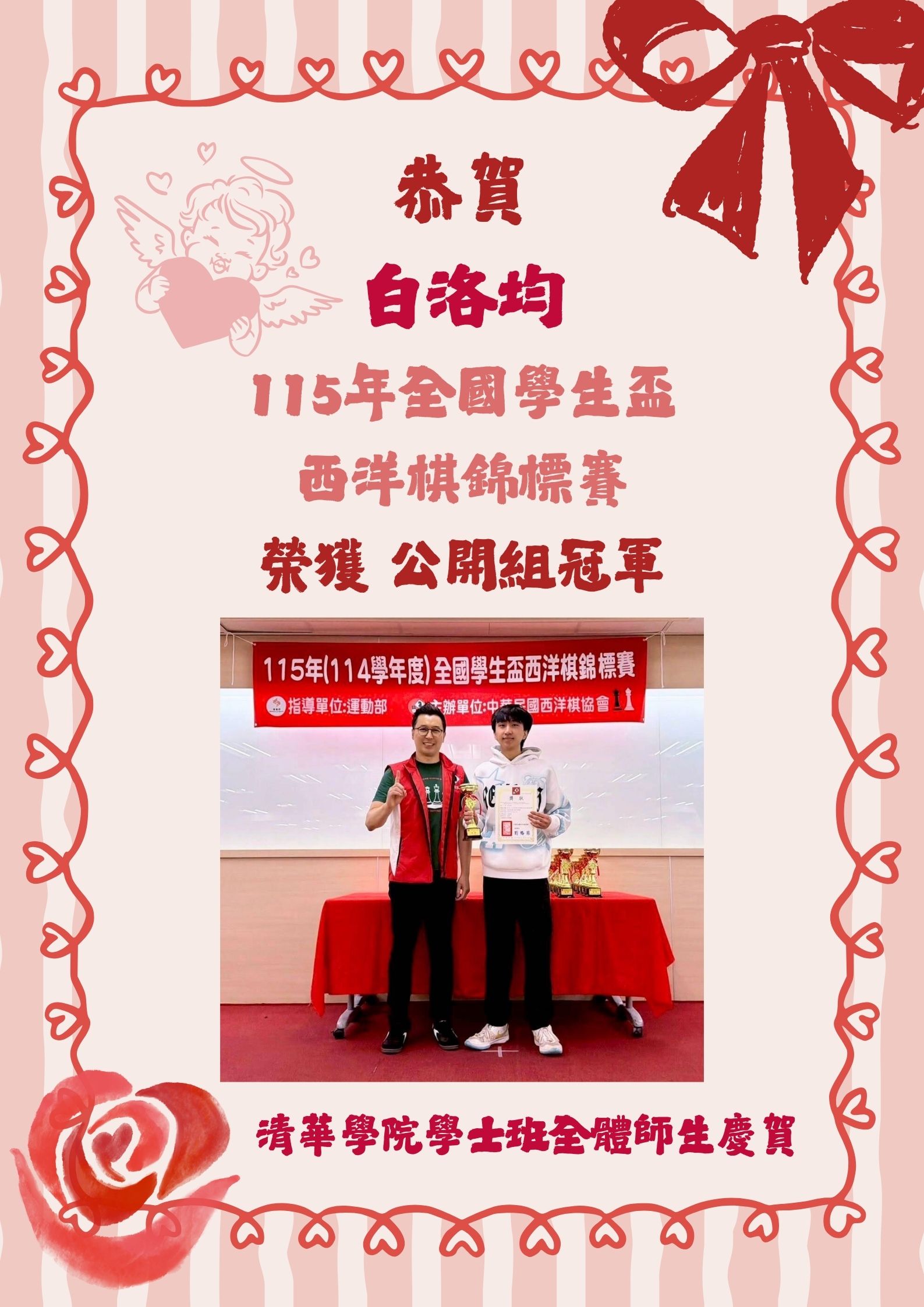恭賀!白洛均同學榮獲115年全國學生盃西洋棋錦標賽公開組冠軍