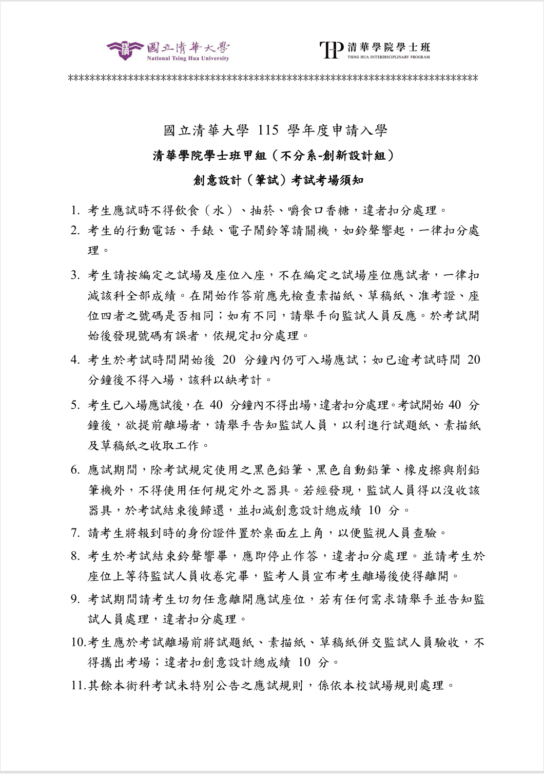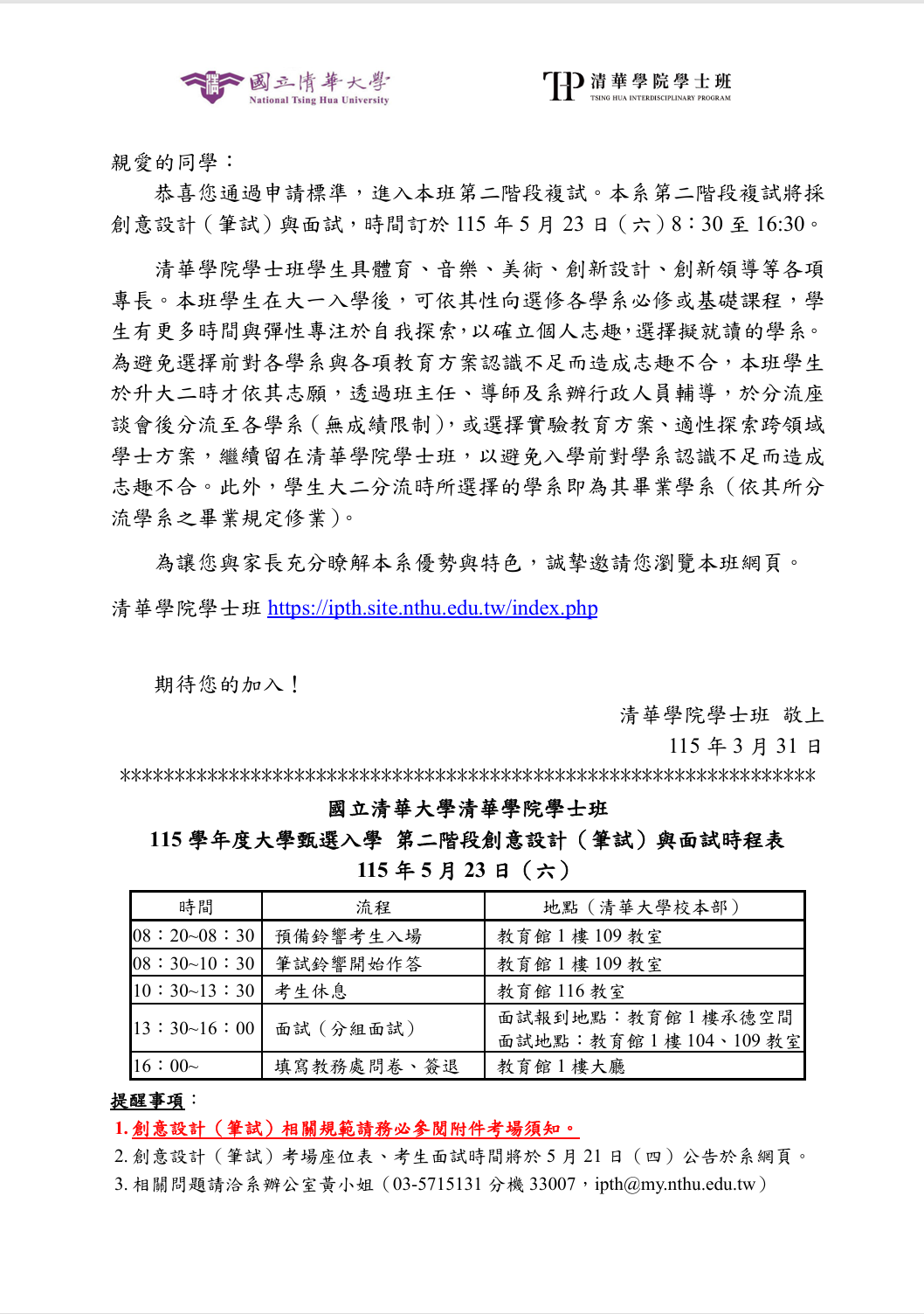 清華學院學士班寄予115學年通過一階考生之信函